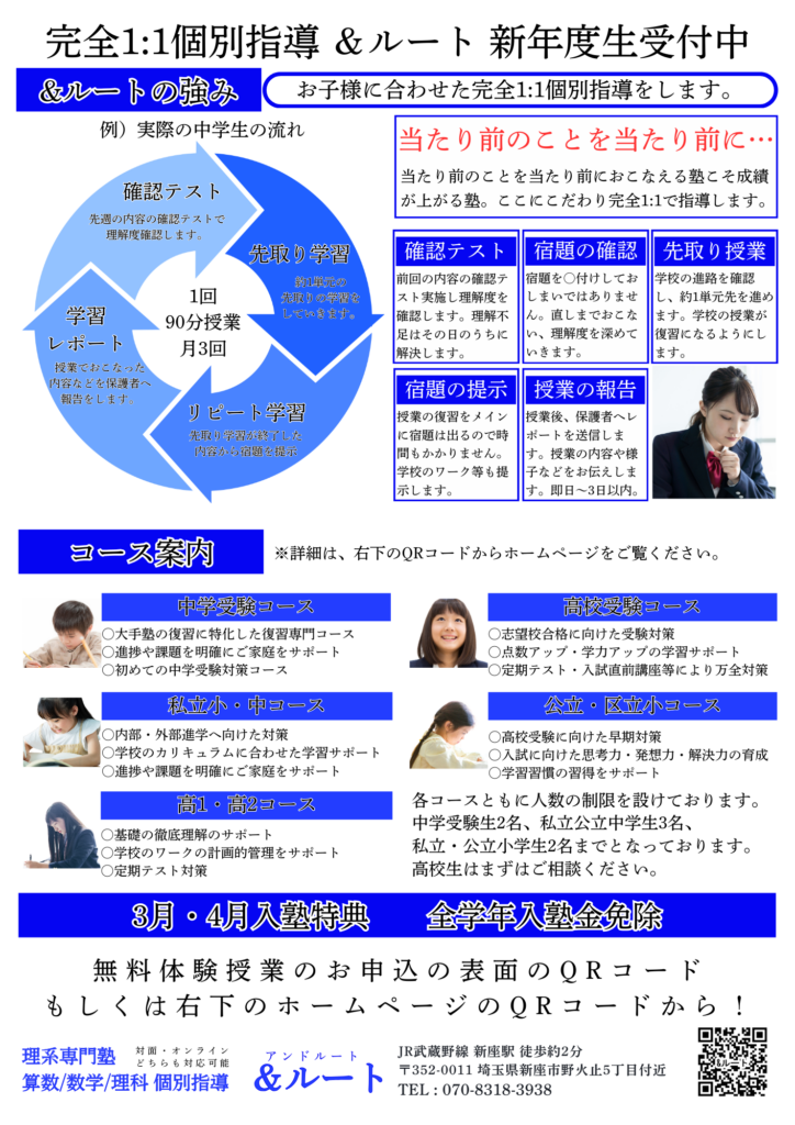 新座駅から徒歩約2分の場所にあり、通塾にも便利で学校帰りにも授業可能です!