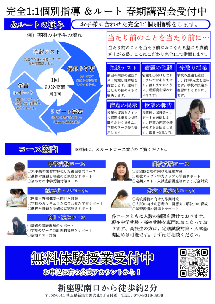 受け入れ人数には限りがございますが、西武台新座中学校の最寄り駅にある当塾をご利用ください。またご一読いただいた他の私立・公立中学校の方にも学校に合わせた対策をおこなっておりますのでご利用いただければと存じます。