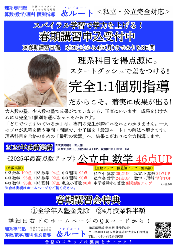 3月から先取り学習を始めている塾は多いです。4月からと思っている方は、遅れをとっています。その遅れを完全1:1個別指導で取り返してみませんか?特に小6、中3の受験生は大切な1学期となります。友達が行っているからではなく、本気の塾選びをおこない、結果を出せるようにしていきましょう。