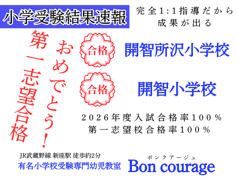 小学校受験 Bon courage(ボンクアージュ)も系列の塾としてございます。担当は塾長が担当します。ペーパー、巧緻性・絵画など運動以外の学力の強化をしていきます。塾長は、埼玉県の小学校、開智小学校、開智所沢小学校、さとえ学園小学校、星野小学校、西武学園文理小学校、浦和ルーテル小学校への高い合格実績を誇っております(東京都の合格実績も当然あります)。また、学力面だけでなく、入試で必要な礼儀なども合わせてご家庭へ指導をしていきます。
